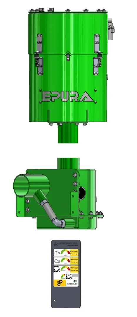 Dust-laden air enters through the base of the Epura systems and passes through a high-efficiency filter, equipped with a Spunbond membrane coated with PTFE. When the Epura system’s filter reaches a saturation level, a cleaning cycle using low-frequency sounds becomes necessary. This is done by stopping and restarting the equipment’s engine, which cleans the filter without any real interruption, with the cleaning cycle lasting an average of 10 seconds.